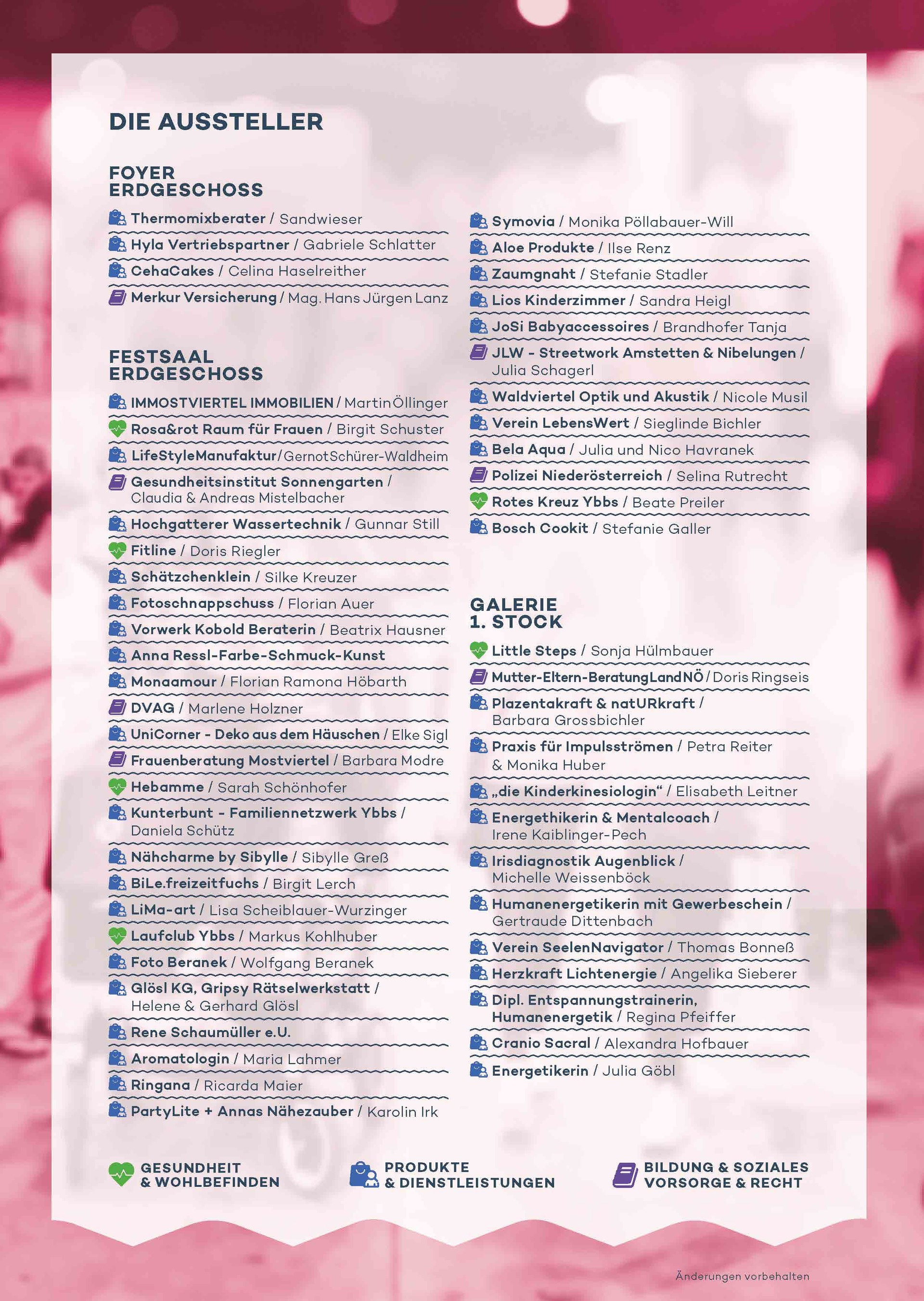 Die Ybbser Familienmesse bietet eine Vielzahl von Ausstellern, die sich mit Themen wie Schwangerschaft, Geburt und dem Familienleben im Allgemeinen beschäftigen. Anbieter präsentieren Produkte und Dienstleistungen für werdende Eltern sowie Unterstützung für Familien in verschiedenen Lebenslagen. Von Babyausstattung über Gesundheitsdienstleistungen bis hin zu Freizeitangeboten können Besucherinnen und Besucher eine breite Palette an Informationen und Inspirationen erwarten. Eltern, Großeltern und alle Interessierte finden hier wertvolle Ressourcen, um ihre Reise in die Elternschaft zu bereichern und das Familienleben zu gestalten.